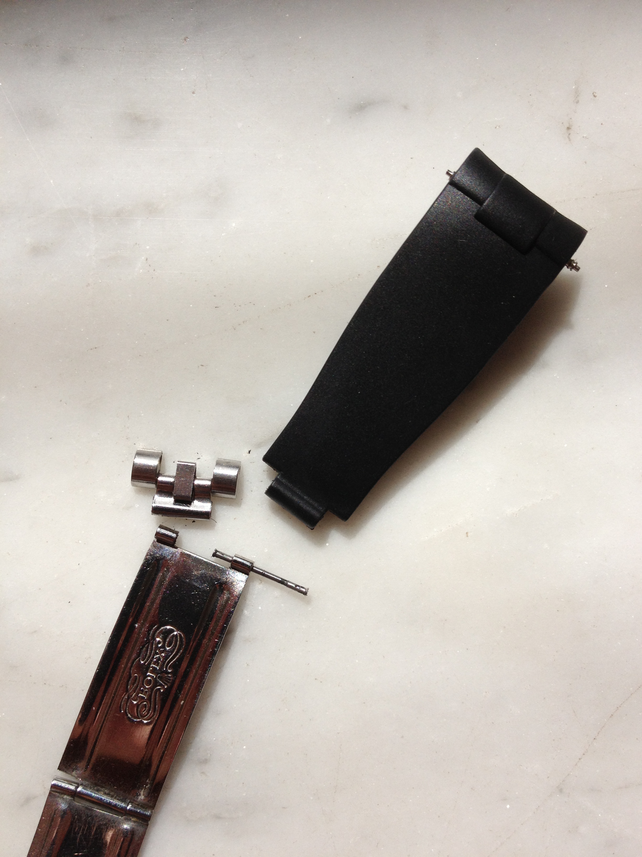 Having checked that the rounded ends would fit the actual watch case, and that the spring bar holes aligned, I set about dismantling the clasp from the bracelet so that I could fit the rubber strap. On the jubilee strap this requires tapping out the cotter pin to detach the bracelet.